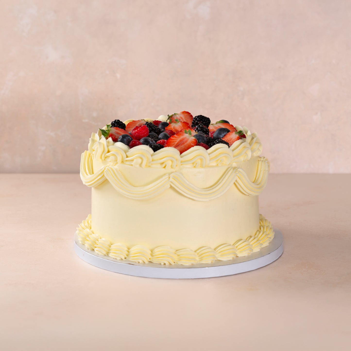 Light vanilla sponge layered with vanilla buttercream icing, topped with fresh fruits.
